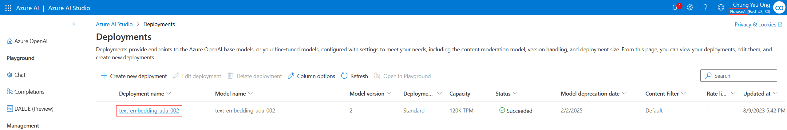 3. Copy & Paste each details (API Key, Instance & Deployment name, [API Version](https://learn.microsoft.com/en-us/azure/ai-services/openai/reference#chat-completions)) into **Azure OpenAI Embeddings** credential