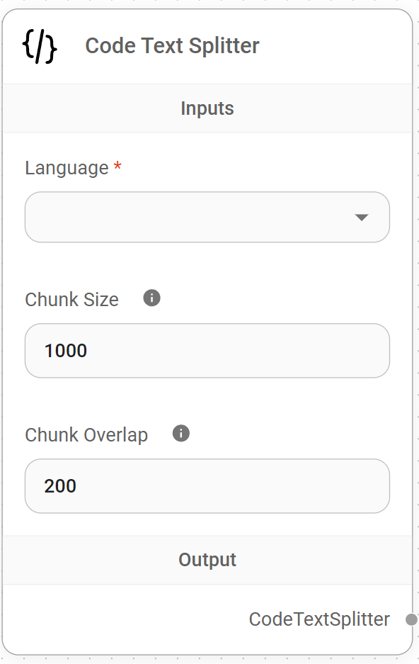 <figure><img src="https://662370747-files.gitbook.io/~/files/v0/b/gitbook-x-prod.appspot.com/o/spaces%2F3VoWwSsyrEg0DEvIIjv9%2Fuploads%2Fgit-blob-756d00fd7880e25c80f7167c1a73dcb0349341b1%2Fimage%20(151).png?alt=media" alt="" width="296"><figcaption><p>Code Text Splitter Node</p></figcaption></figure>
