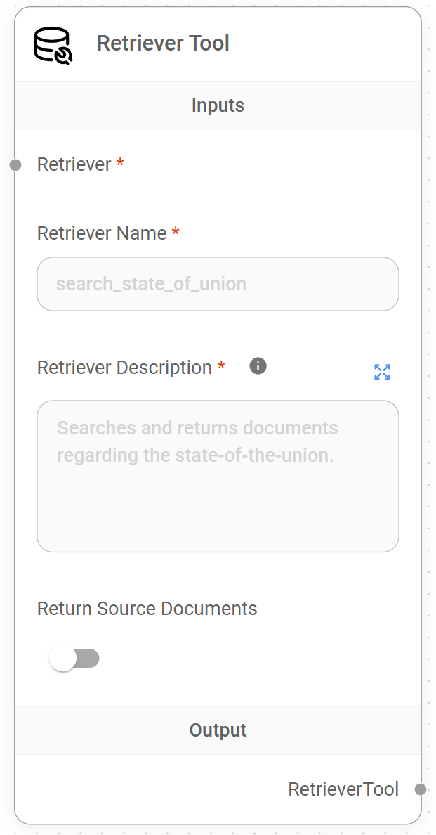 <figure><img src="https://662370747-files.gitbook.io/~/files/v0/b/gitbook-x-prod.appspot.com/o/spaces%2F3VoWwSsyrEg0DEvIIjv9%2Fuploads%2Fgit-blob-72a2fbfb603fca68c42eafdc745fc4238ab04515%2Fimage%20(8)%20(1)%20(1).png?alt=media" alt="" width="311"><figcaption><p>Retriever Tool Node</p></figcaption></figure>
