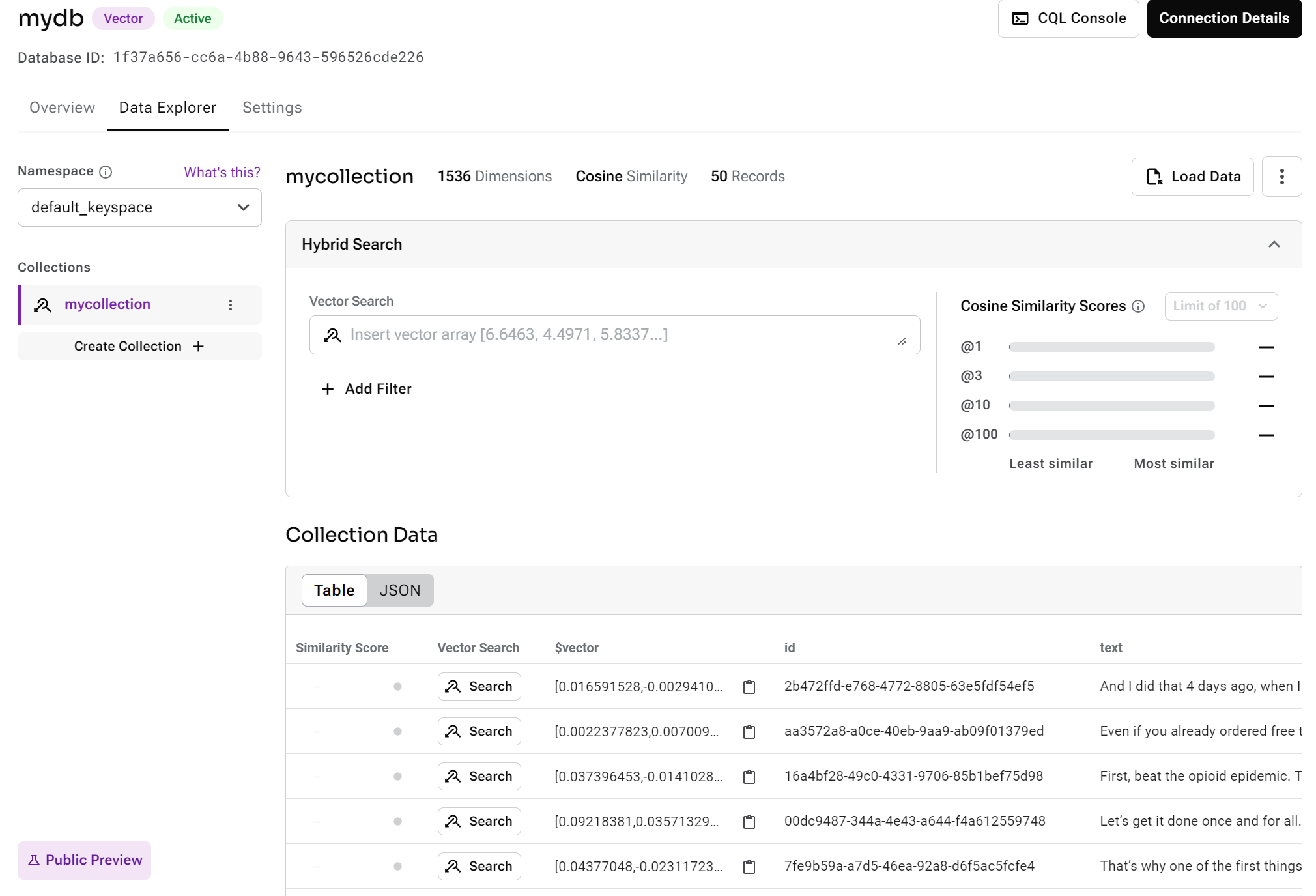 9. Navigate back to Astra portal, and to your collection, you will be able to see all the data that has been upserted: