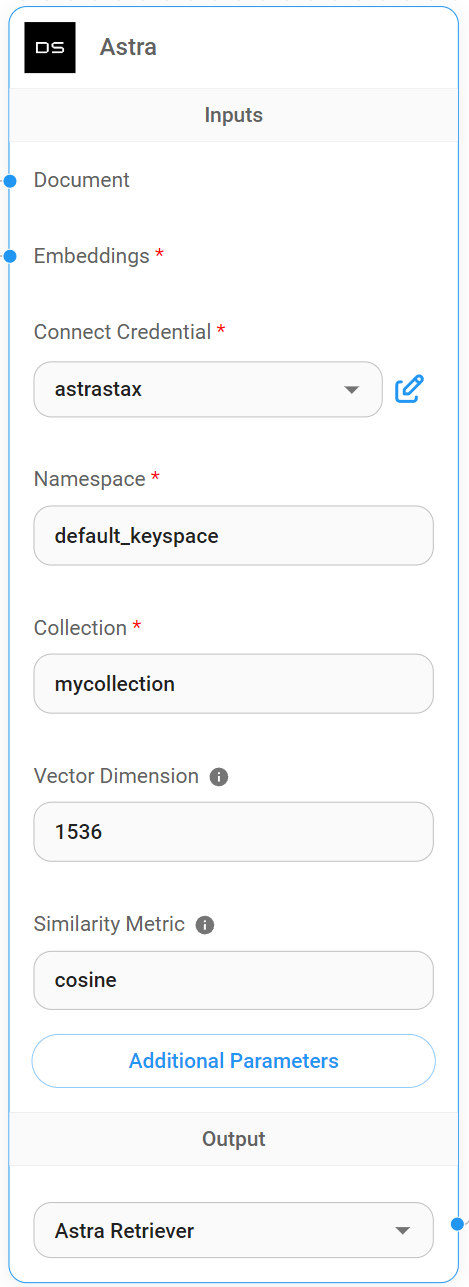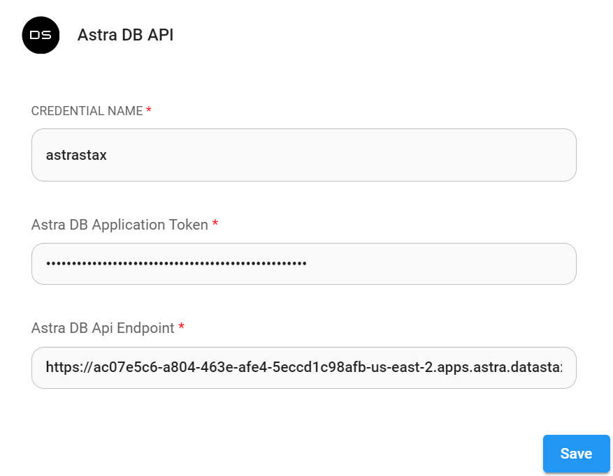 6. Back to your canvas, drag and drop Astra node. Click **Create New** from the Credentials dropdown: