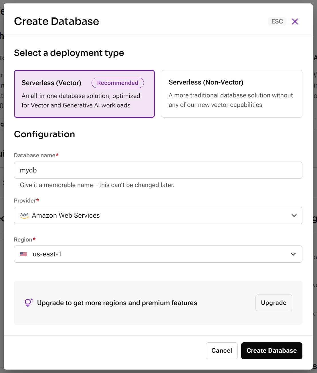 3. Choose Serverless (Vector), fill in the Database name, Provider, and Region