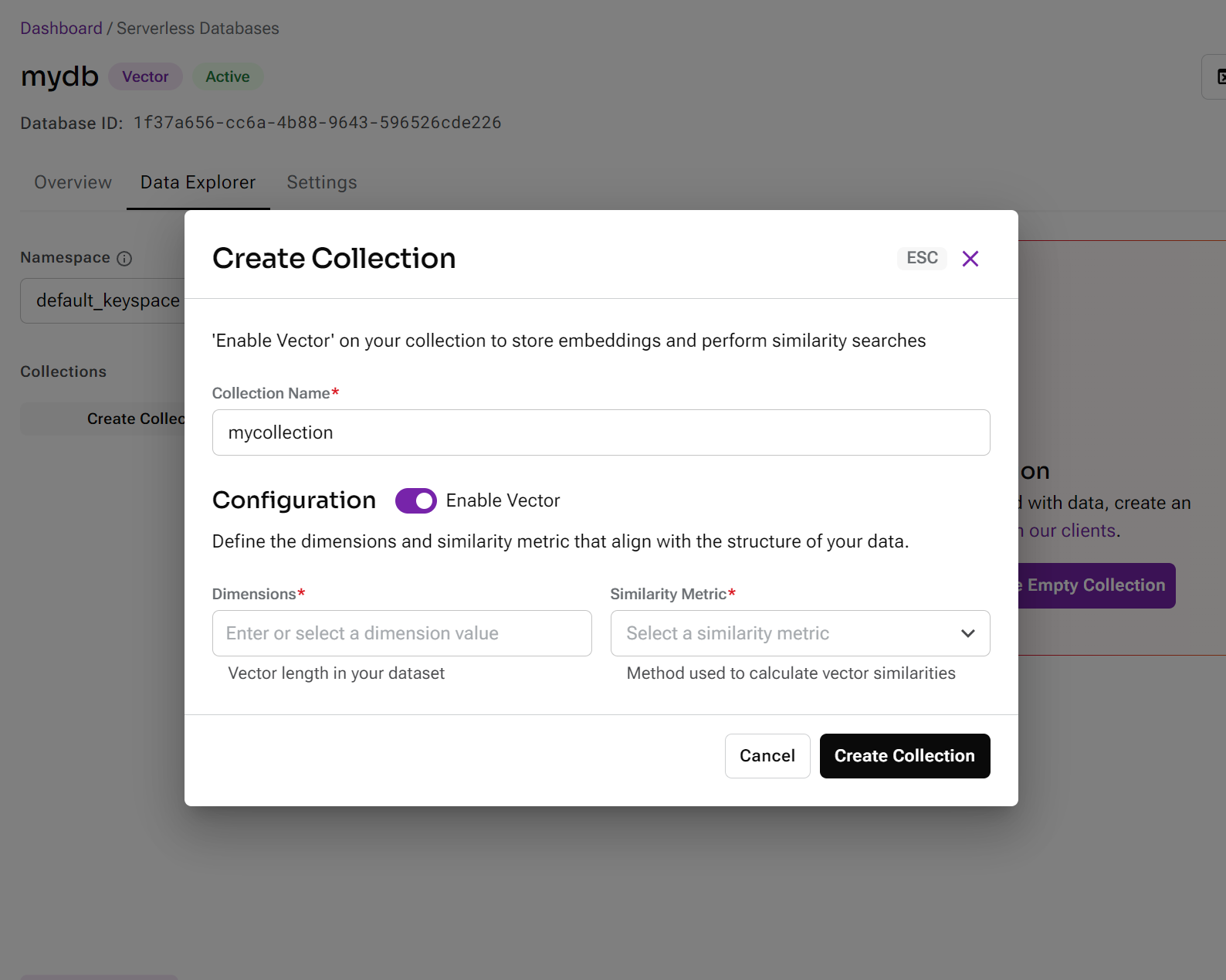 5. Create a new collection, select the desired dimenstion and similarity metric: