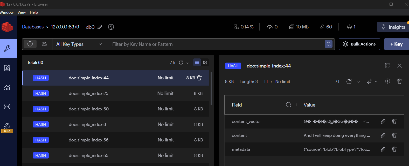6. Navigate to Redis Insight portal, and to your database, you will be able to see all the data that has been upserted: