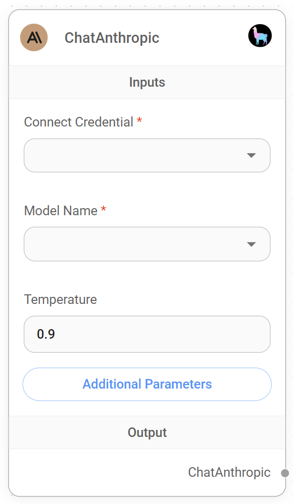 <figure><img src="https://662370747-files.gitbook.io/~/files/v0/b/gitbook-x-prod.appspot.com/o/spaces%2F3VoWwSsyrEg0DEvIIjv9%2Fuploads%2Fgit-blob-900cafe3a23f4232c076492f8f90d47c4adc665d%2Fimage%20(2)%20(1).png?alt=media" alt="" width="291"><figcaption><p>ChatAnthropic Node</p></figcaption></figure>