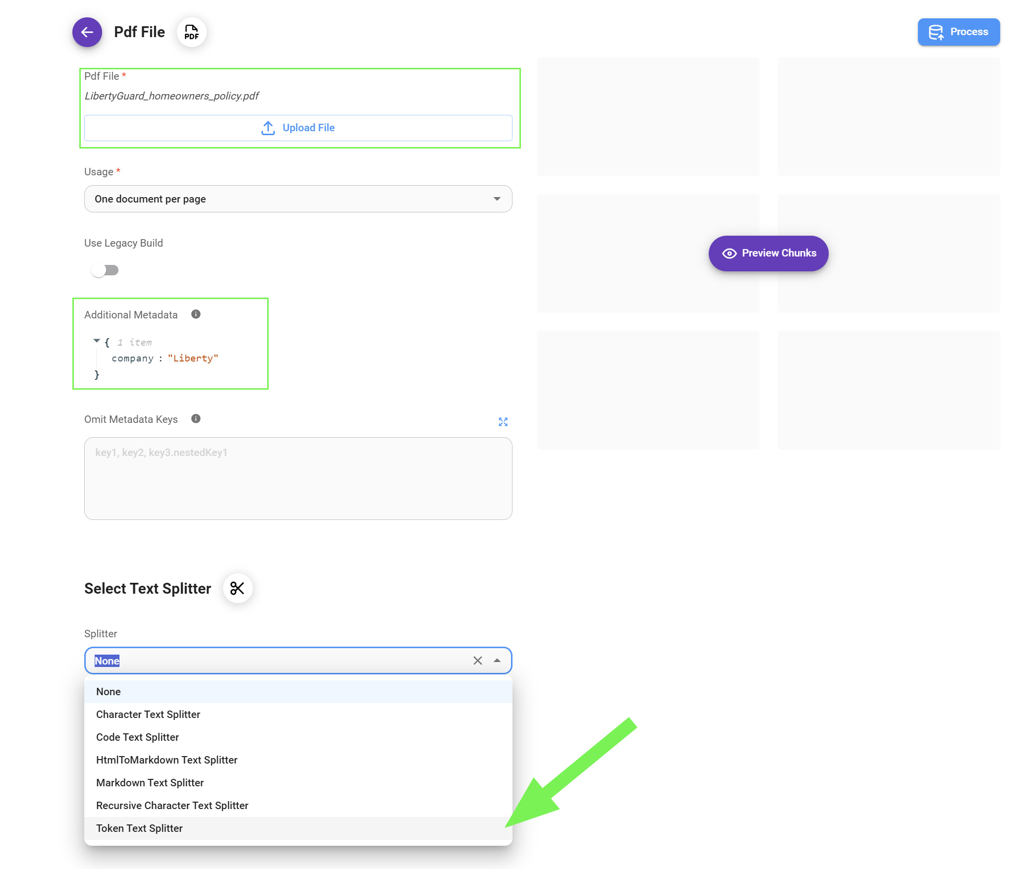 * Finally, select the [Text Splitter](https://tailwindsdocs.innovativesol.com/readme/chatflows/langchain/text-splitters) you want to use to chunk your data. In our particular case, we will use the [Recursive Character Text Splitter](https://tailwindsdocs.innovativesol.com/readme/chatflows/langchain/text-splitters/recursive-character-text-splitter).