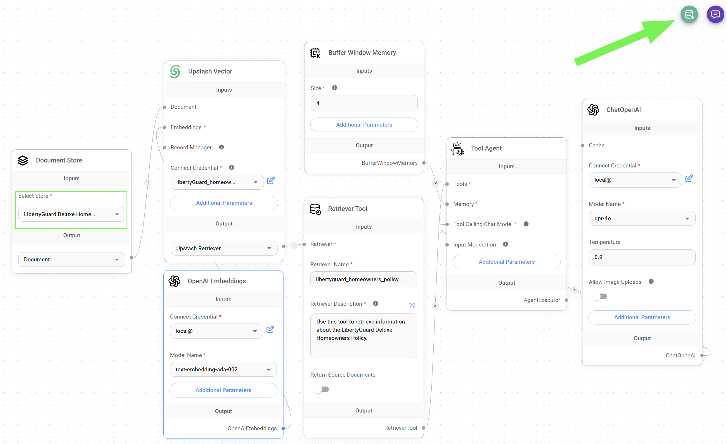 * Upsert your dataset to your [Vector Store](https://tailwindsdocs.innovativesol.com/readme/chatflows/langchain/vector-stores) by clicking the green button in the right corner of your flow. We used the [Upstash Vector Store](https://tailwindsdocs.innovativesol.com/readme/chatflows/langchain/vector-stores/upstash-vector) in our implementation.