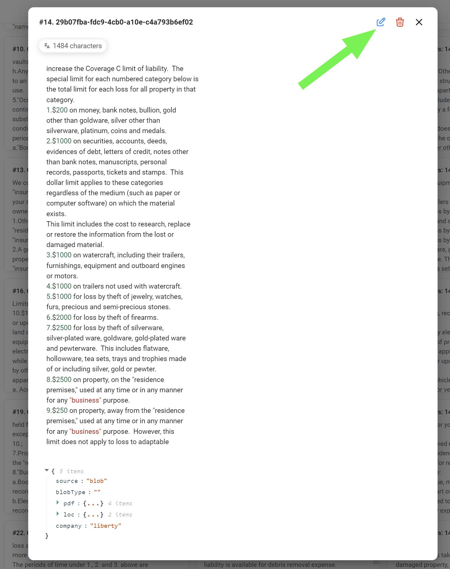 Note that our custom metadata `company: "liberty"` has been inserted into each chunk. This metadata allows us to easily filter and retrieve information from this specific dataset later on, even if we use the same vector store index for other datasets.