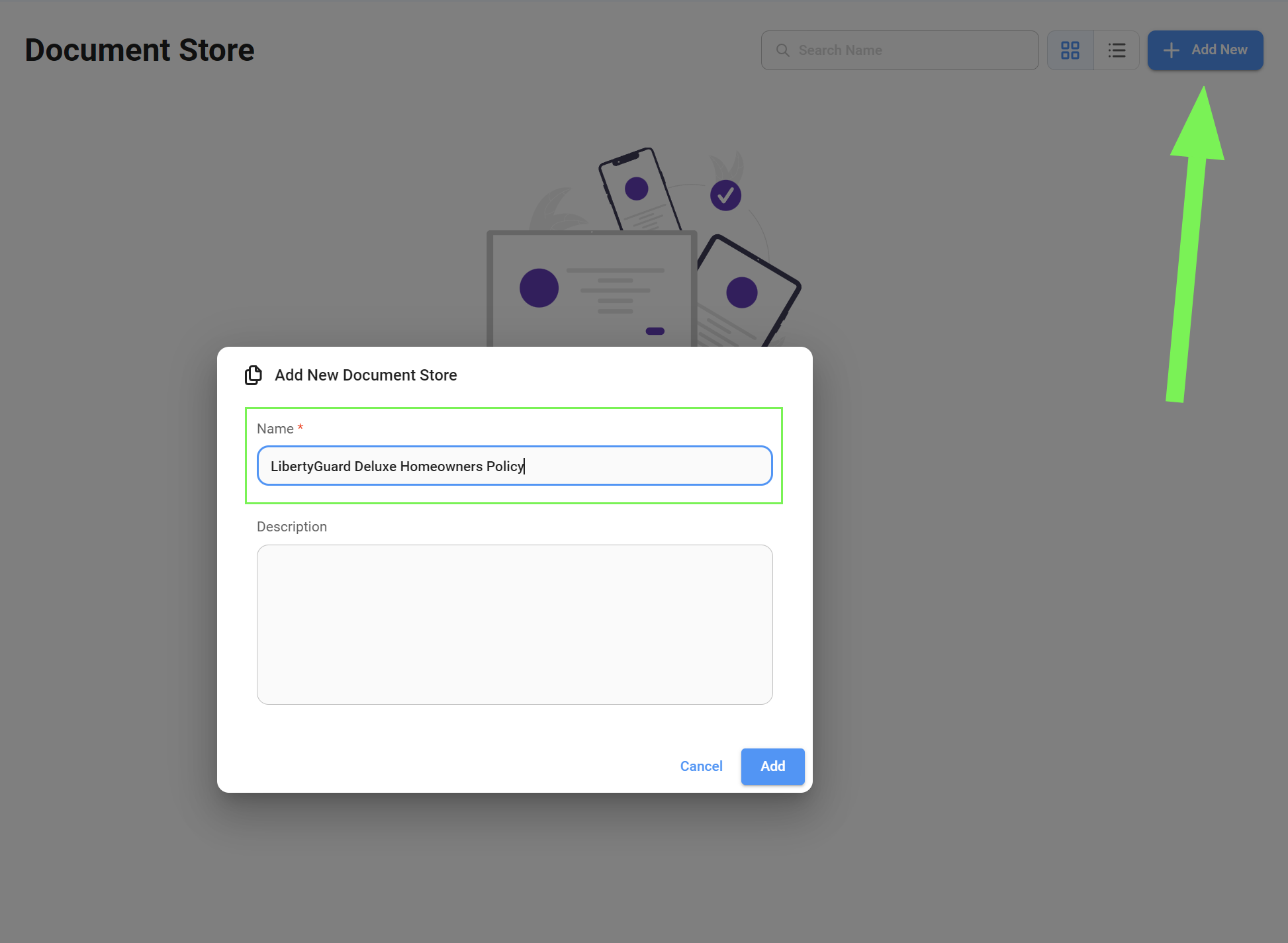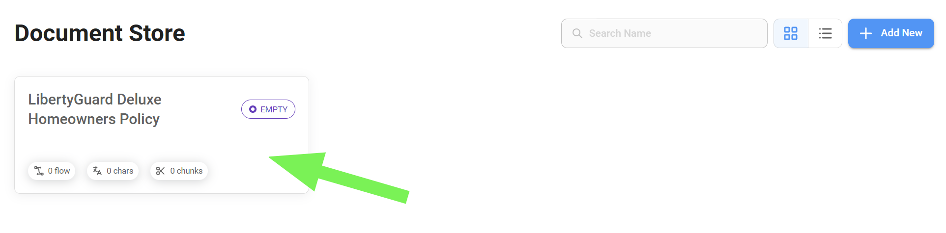 * Start by adding a Document Store and naming it. In our case, "LibertyGuard Deluxe Homeowners Policy".
