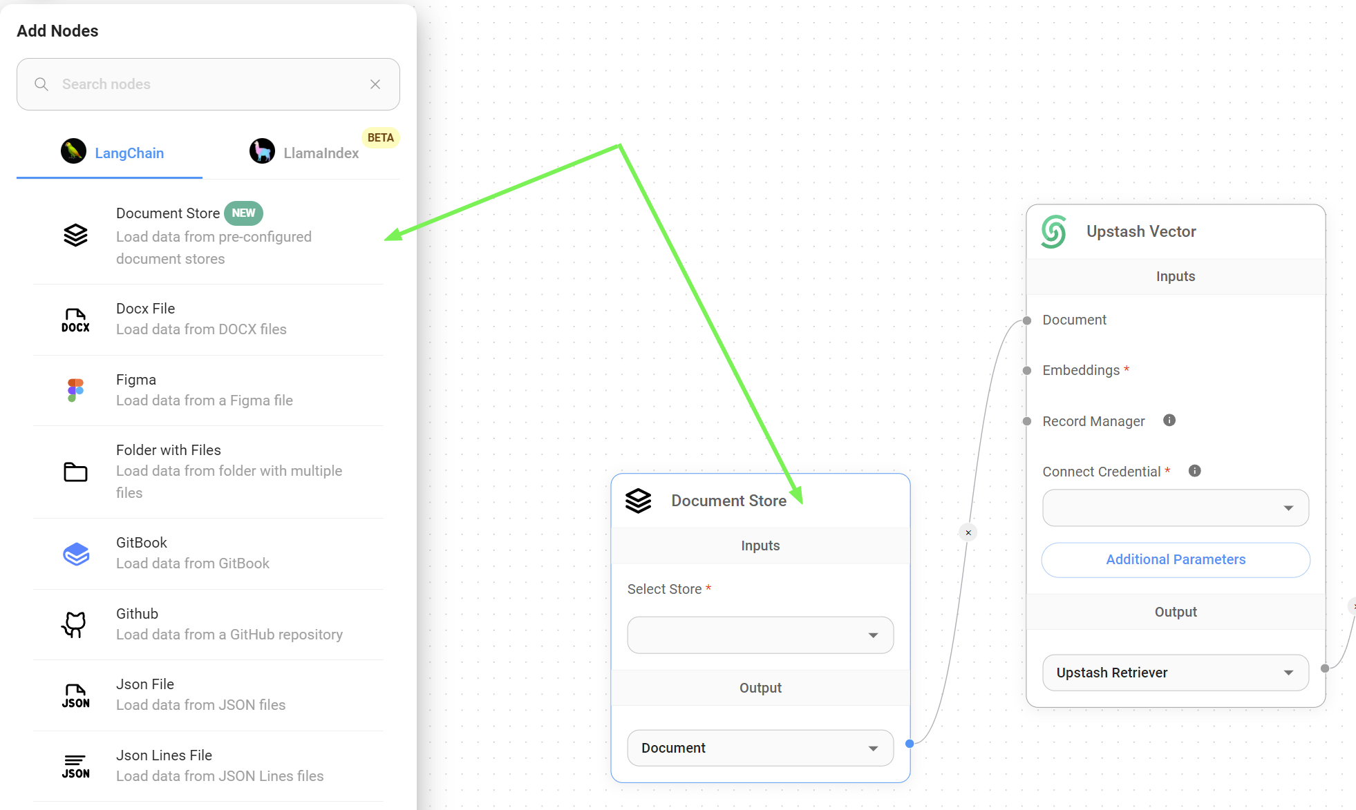 * Now that our dataset is ready to be upserted, it's time to go to your RAG chatflow / agentflow and add the [Document Store node](https://tailwindsdocs.innovativesol.com/readme/chatflows/langchain/document-loaders/document-store) under the **LangChain > Document Loader** section.