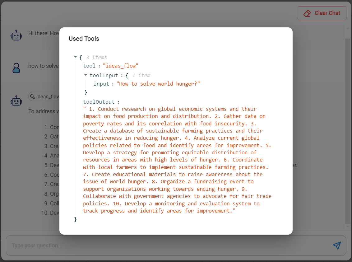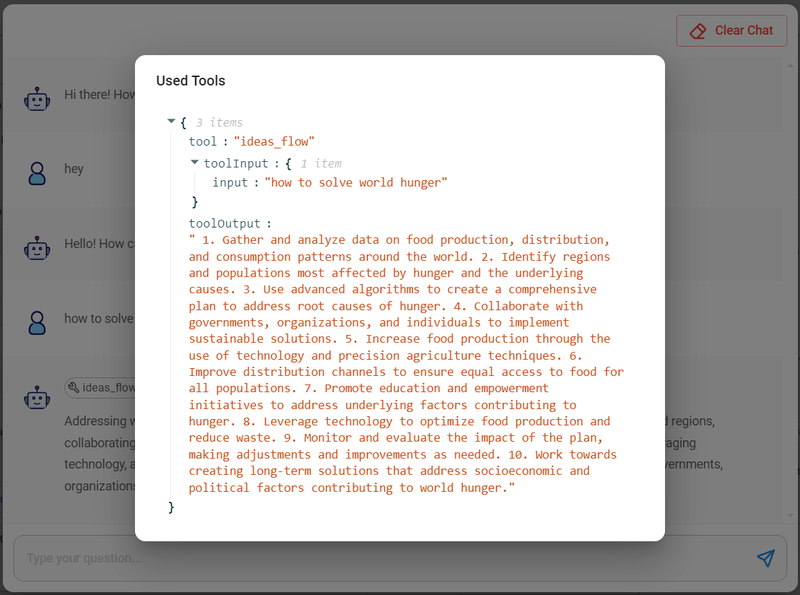 4. From the response, you can see the input and output from the Chatflow Tool: