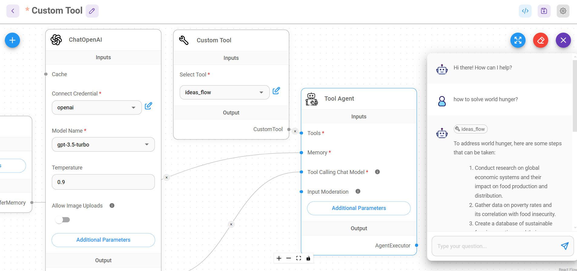 2. Create a Tool Agent + Custom Tool. Specify the tool we've created in Step 1 in the Custom Tool.