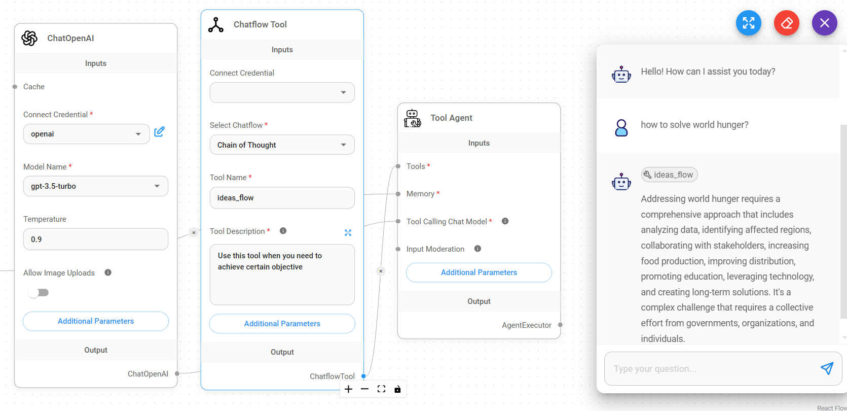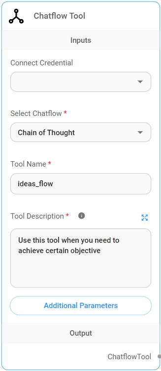 With the same example as above, we are going to create a custom tool that will calls the [Prediction API](https://github.com/innovativeSol/tailwinds-docs/blob/main/using-flowise/api.md#prediction-api) of the Chain of Thought chatflow.