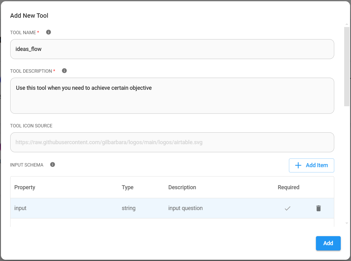 <table><thead><tr><th width="180">Tool Name</th><th>Tool Description</th></tr></thead><tbody><tr><td>ideas_flow</td><td>Use this tool when you need to achieve certain objective</td></tr></tbody></table>
